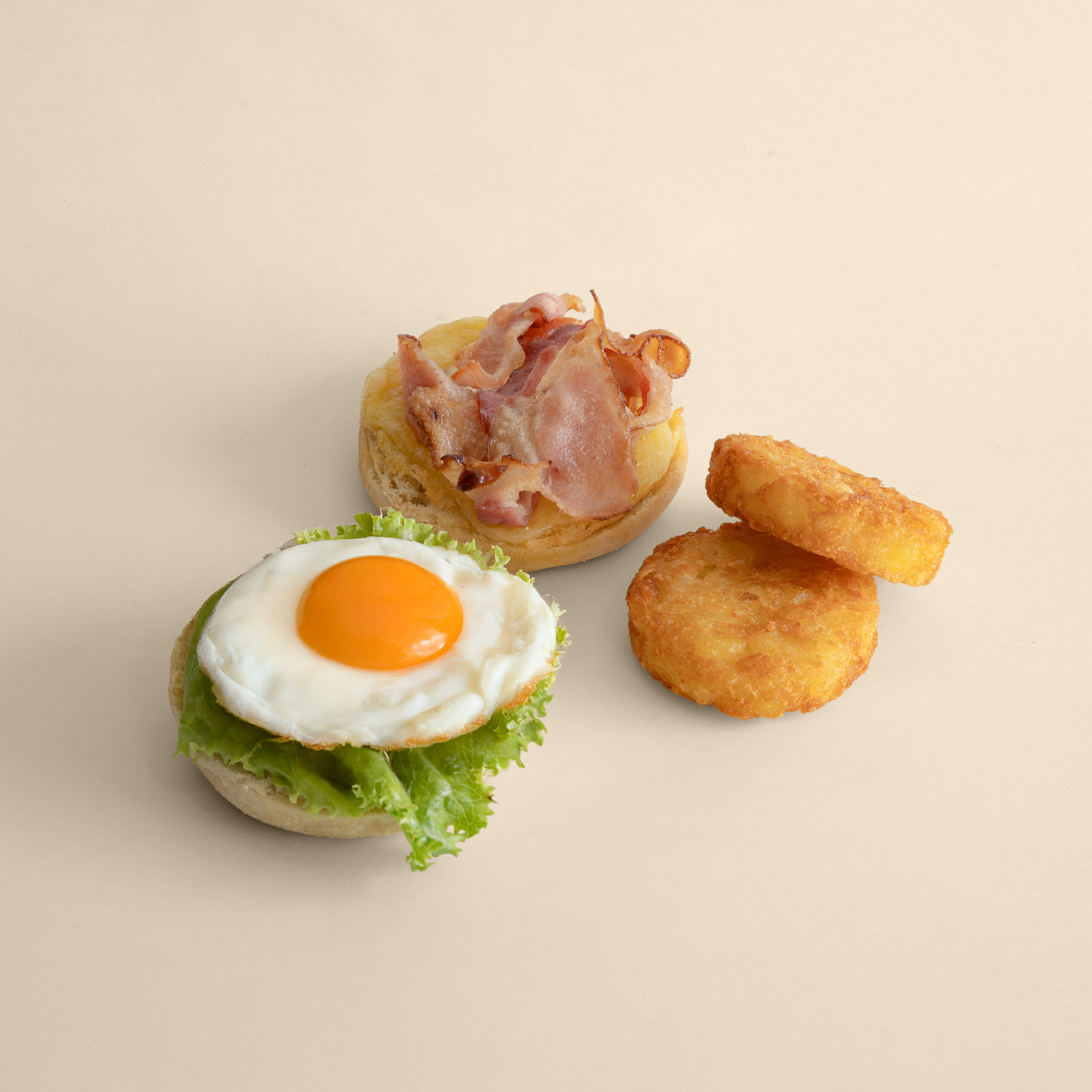 Muffin ligeramente tostado, mantequilla clarificada, huevo frito, tocineta y queso Suizo, acompañado de papas en gajo o hash brown